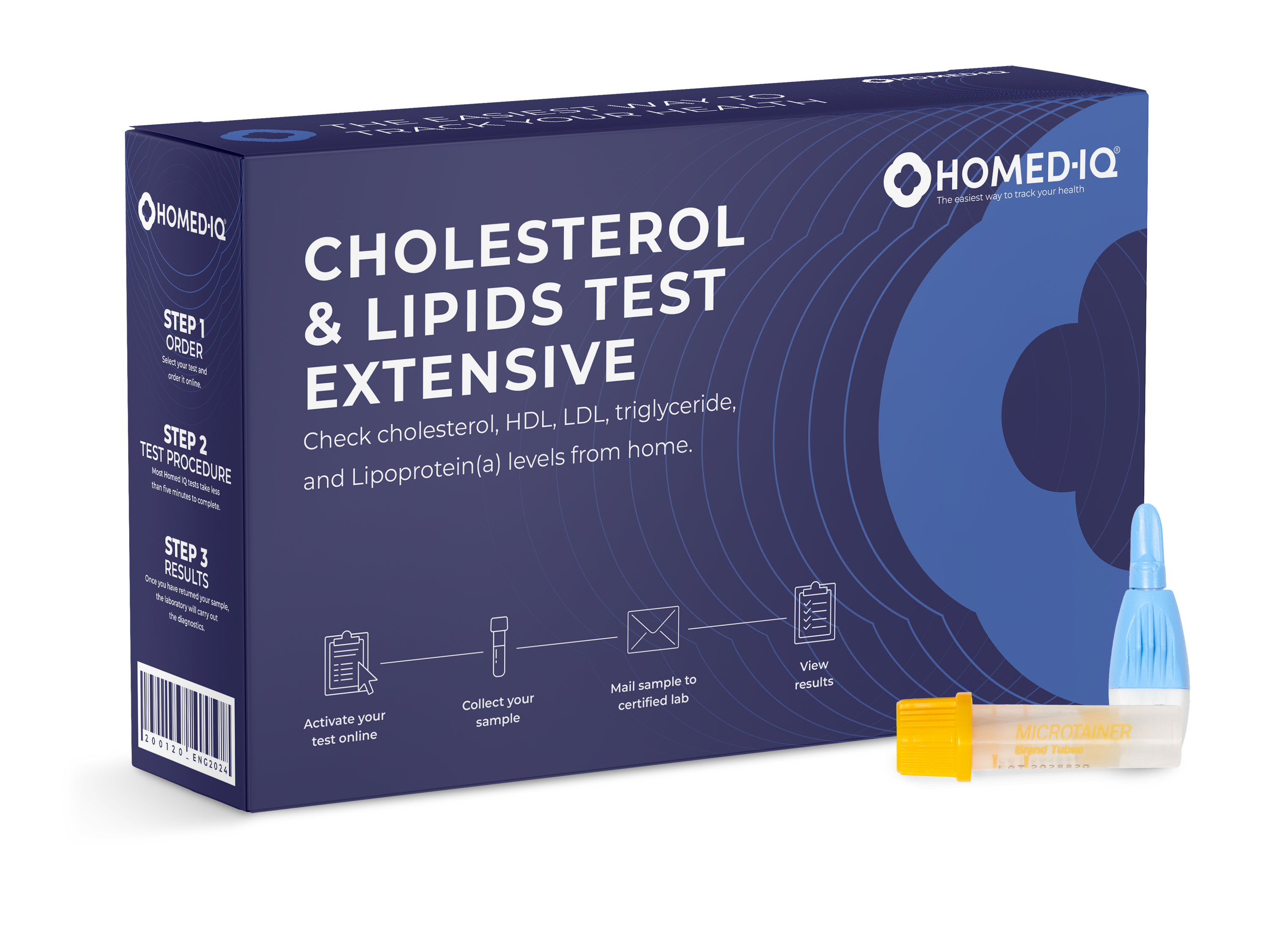 Almost 1 in 4 people worldwide has high cholesterol, and a similar number has elevated levels of Lipoprotein(a)—a lesser-known but significant risk factor for heart disease. Without symptoms, high cholesterol and Lipoprotein(a) can silently increase your risk. Homed-IQ’s Cholesterol Test Extensive helps you take control of your heart health. This at-home test measures five key markers—total cholesterol, HDL, HDL% of total cholesterol, LDL, triglycerides, and Lipoprotein(a)—to give you a complete picture of your cardiovascular risk.